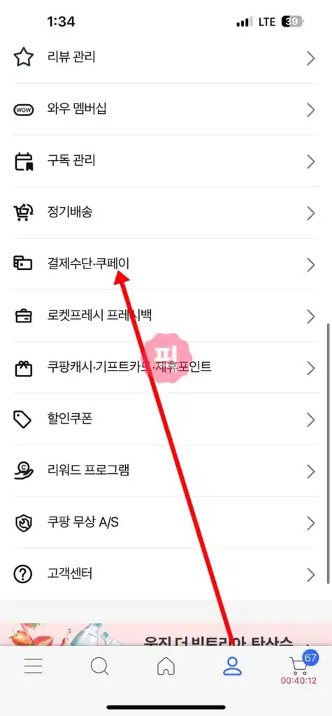 마이쿠팡에서 결제수단.쿠페이를 클릭합니다. 제일 하단에 위치하고 있습니다.