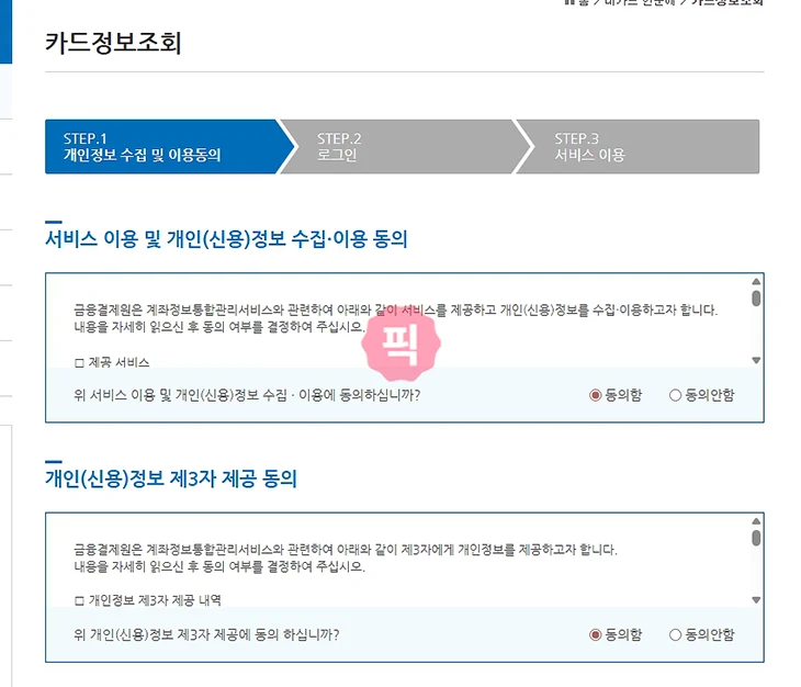 3. 그럼 카드정보조회 화면이 나오고 먼저 개인정보 수집 및 동의 > 로그인 > 서비스 이용 순으로 진행이 됩니다. 약관에 전부 동의하고 정보 입력 버튼을 클릭합니다.