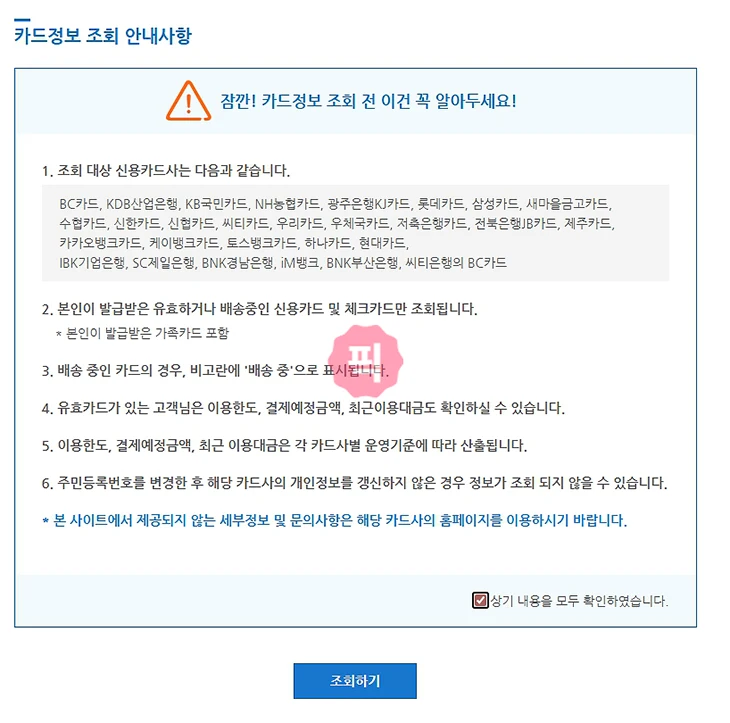 5. 카드정보 조회 안내사항을 확인하고 조회하기 버튼을 클릭합니다.