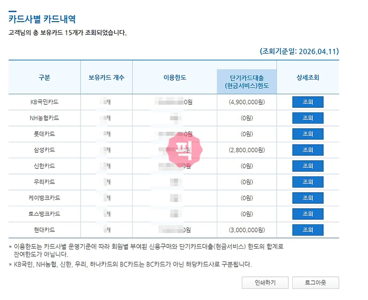 6. 조회하기 화면에서는 카드사별 보유카드 개수, 이용한도 등을 확인할 수가 있습니다.