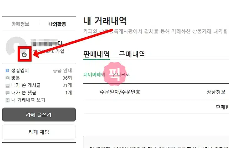 카페 홈에서 왼쪽이나 오른쪽에 보이는 나의활동 탭을 클릭합니다. 그러면 내 프로필이 보이는데 설정 아이콘을 눌러 프로필 설정 화면으로 이동합니다.