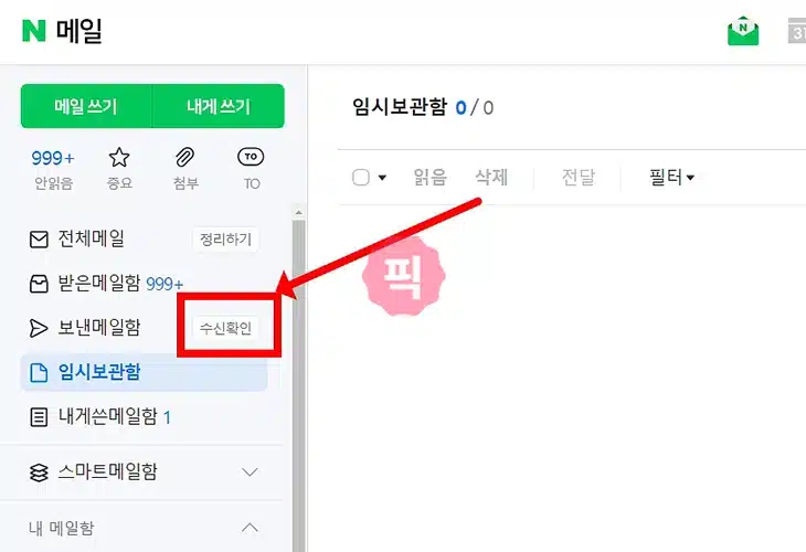 네이버 홈페이지에서 로그인 후 네이버 메일을 클릭을 해서 메인에 접속합니다. 그리고 나서 메일 왼쪽에 보이는 수신확인 버튼을 눌러주세요.