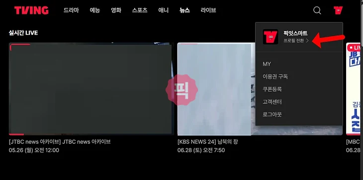 2. 로그인 상태에서 티빙 홈 화면 오른쪽 프로필에 마우스를 올리면 메뉴가 나오는데 프로필 전환을 클릭합니다.