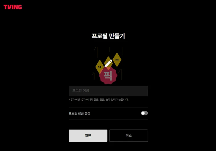 4. 프로필 만들기 화면에서 프로필 이름 2자 이상 10자 이내의 한글, 영문, 숫자를 입력하고 프로필 이미지 등록 후 확인 버튼을 누르면 티빙 프로필 생성이 완료가 됩니다.