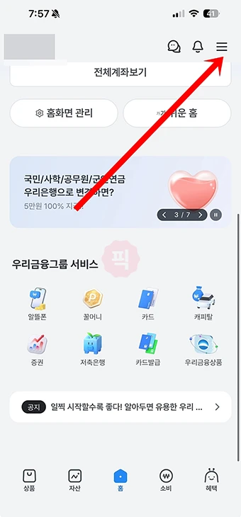 스마트폰에 우리은행 앱이 설치가 있다면 지금 바로 해볼 수가 있는 방법입니다.